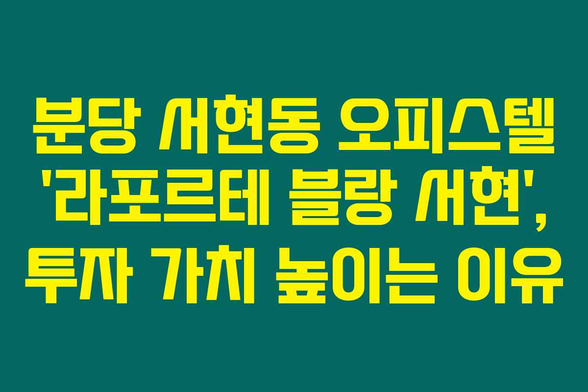 제가 직접 경험해본 결과로는 분당 서현동 오피스텔인 ‘라포르테 블랑 서현’은 탁월한 입지와 시설을 갖춰 투자 가치를 높이는 요소가 많아요. 최근 부동산 시장에서 이 오피스텔에 대한 관심이 커지고 있는데, 그 이유를 아래를 읽어보시면 알 수 있습니다.