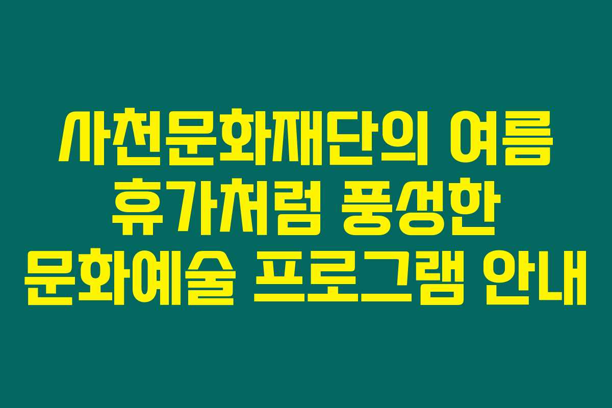 사천문화재단의 다양한 문화예술 프로그램은 여름을 특별하게 만들어줄 좋은 기회랍니다. 잊지 말고 참여해보세요! 여름휴가의 짜릿한 즐거움을 만끽하실 수 있을 거예요.