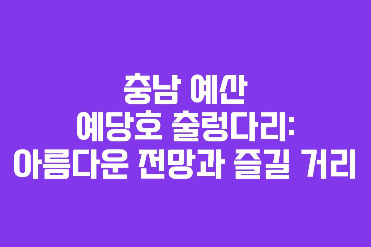 충남 예산의 예당호 출렁다리는 시원한 전망과 아름다운 경치를 자랑하는 인기 관광지입니다. 이곳은 예당호와 접해 있어 자연의 아름다움을 만끽할 수 있으며, 매년 많은 관광객들이 방문하고 있습니다.