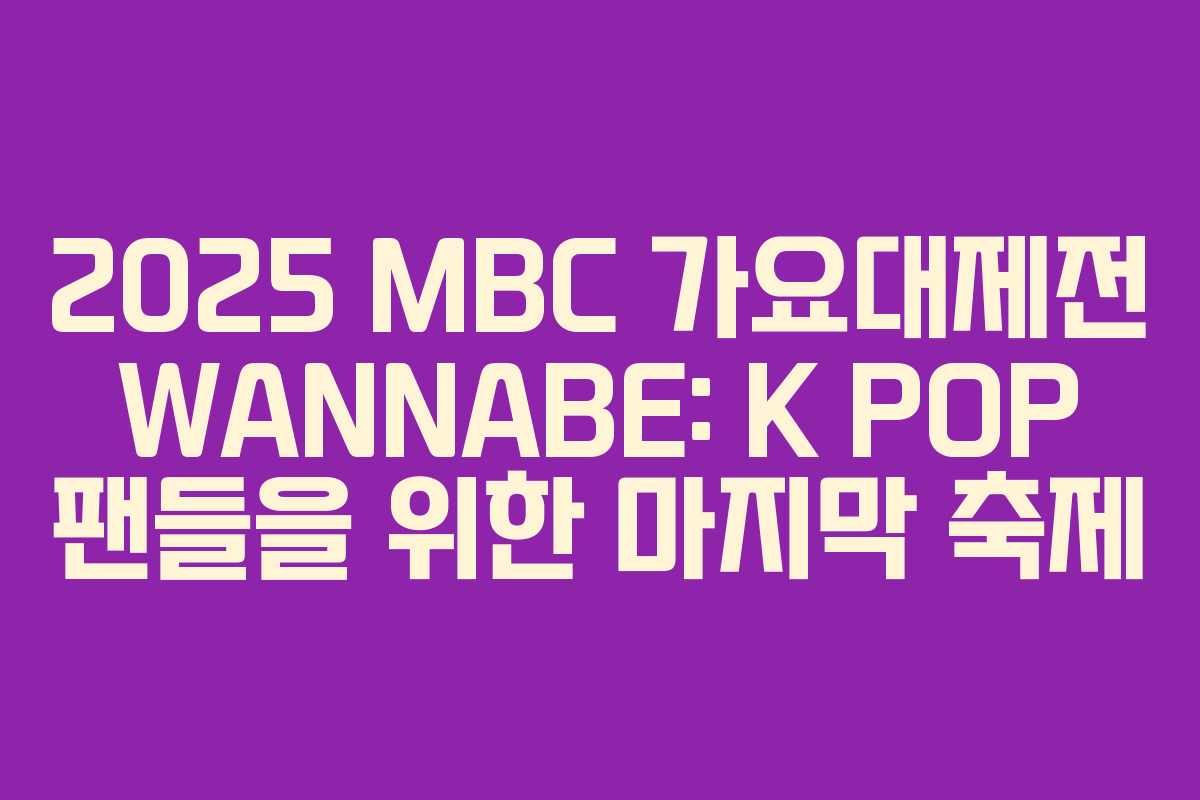 2024년의 마지막 날, K-POP 팬들에게 특별한 축제가 열립니다. 바로 2025 MBC 가요대제전 WANNABE입니다. 이 축제는 화려한 무대와 특별한 콜라보레이션으로 연말의 분위기를 한껏 고조시킬 예정입니다. 방송을 통해 시청할 수 있을 뿐만 아니라, 현장 방청의 기회도 있으니 놓치지 마세요.